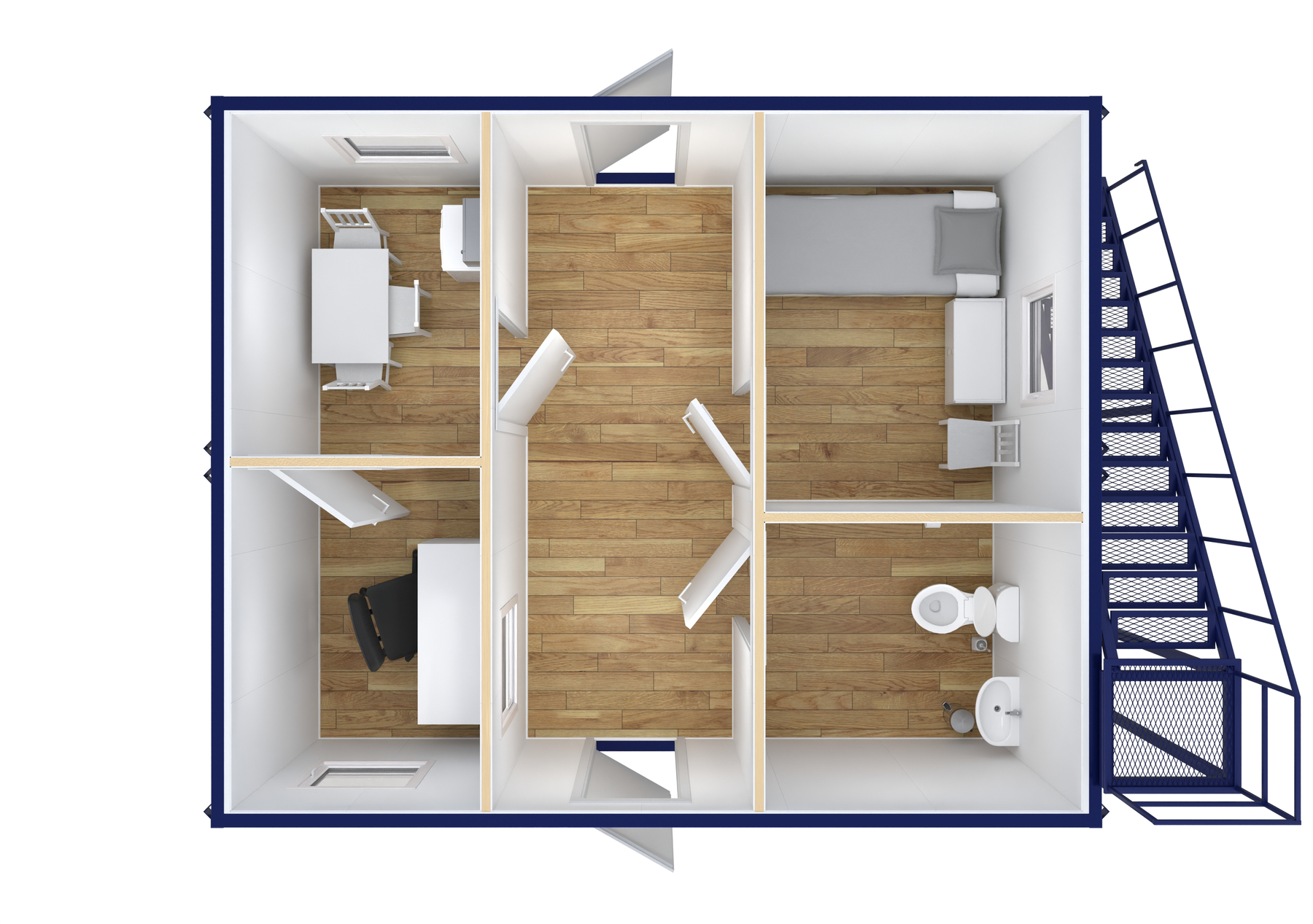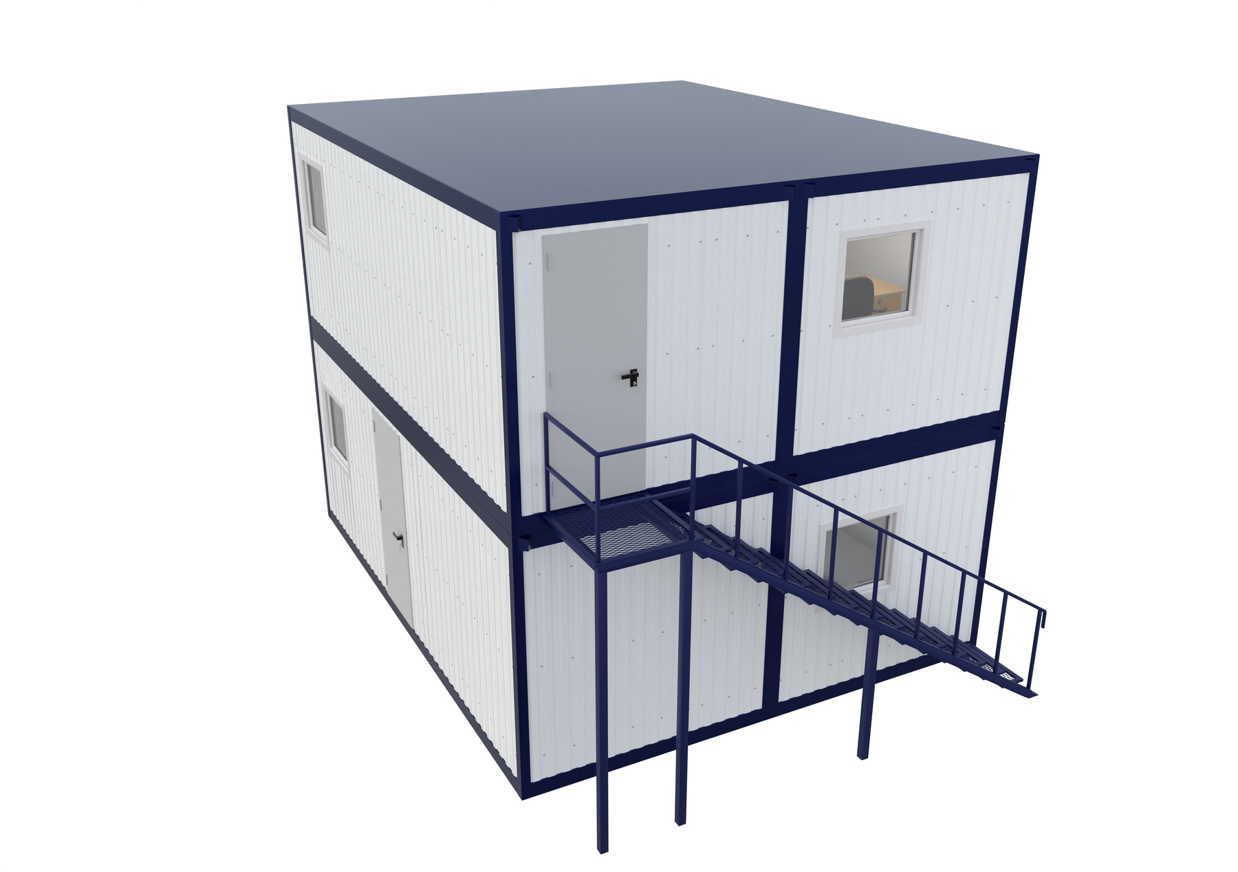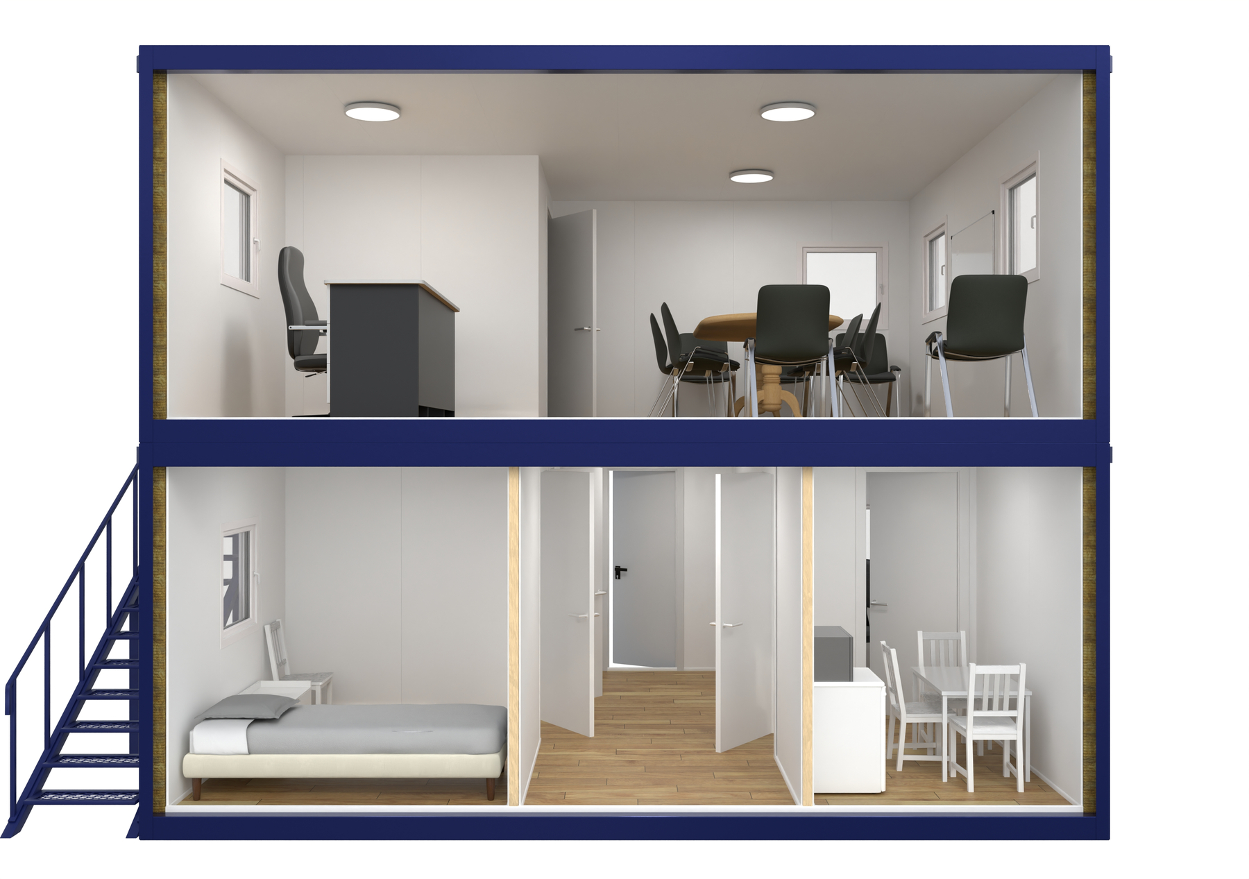 Un ansamblu de containere P+1 reprezintă o soluție modulară pe două niveluri (parter + un etaj) ideală pentru companii care au nevoie de spații de birouri rapide, eficiente și flexibile. Prin utilizarea containerelor modulare, obții un sediu operativ într-un timp scurt, cu costuri semnificativ reduse comparativ cu construcțiile tradiționale.