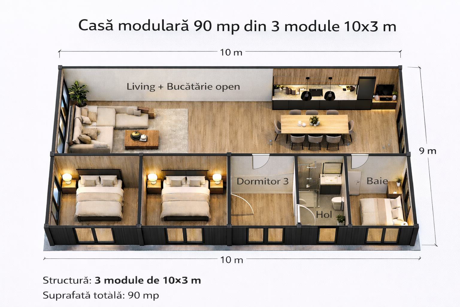 Casă modulară 90 mp din 3 module 10×3 m personalizabilă