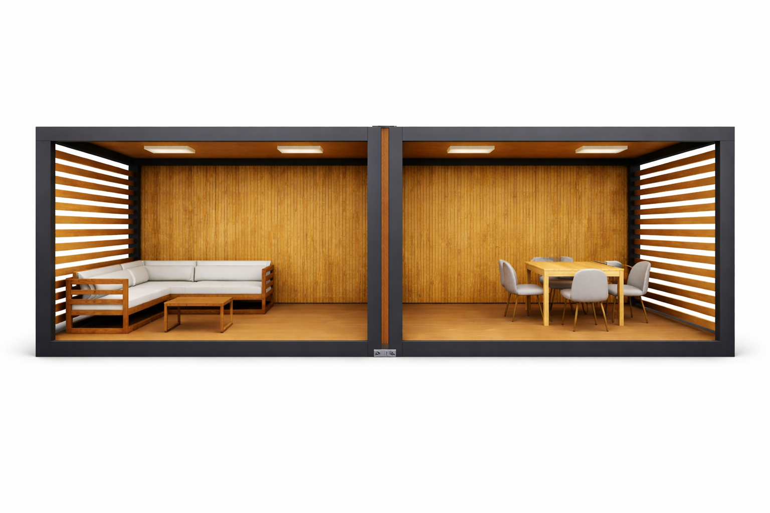 Datorită configurației din două module 6×3 m, spațiul interior este optimizat pentru funcționalitate și confort. Se pot crea zone separate pentru servire, lucru sau relaxare, fără a compromite eficiența utilizării suprafeței. În plus, sistemul modular permite extinderea ulterioară sau relocarea containerului, oferind flexibilitate pe termen lung.